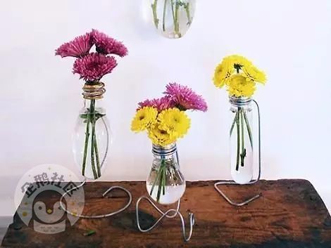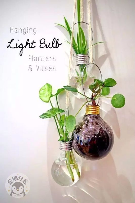 将灯泡底部的固件拆除,然后用它装上水,就是一个小小的水培瓶,养上绿萝和鲜花,随意挂起来,就美翻了!