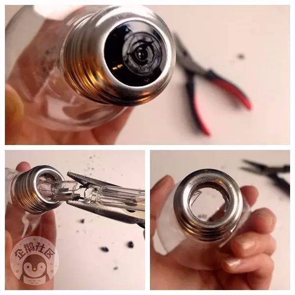 拆除时,先用钳子拧下灯泡底座的胶壳,然后将灯芯小心抽出,处理好瓶口的铁丝和碎玻璃,以免受伤。