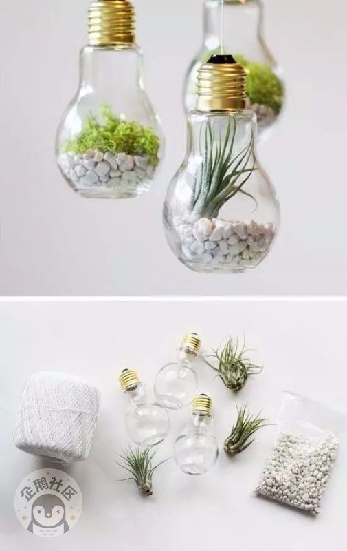 另外,旧灯泡最合适用来培育需水较少的空气凤梨和苔藓植物,只要铺上一层园艺珍珠岩,无土也能栽培。