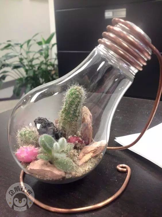 在灯泡螺丝口处绕上一根铁丝,拧出一个圆弧状底座,就能将一只普普通通的灯泡,变成精美的微观生态瓶,能给仙人球等耐旱植物,提供充足的光照和养分。