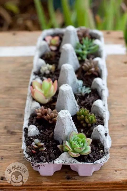 不仅能用鸡蛋壳来种花,买鸡蛋时的包装盒也能改造成小花盆,种上各类姿态万千的小多肉,鸡蛋盒就变成了肉肉组合盆栽。