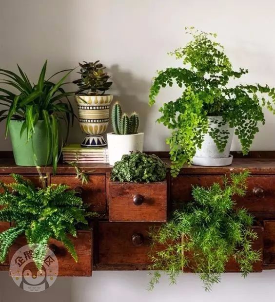 因为木质的吸收性、渗透性都很好,用来做花盆是完全没问题的。你瞧这些小抽屉拉来填上土壤,就能变成一组绿植装饰柜。看着郁郁葱葱的植物,从抽屉柜子里探头探脑地长出来,这种体验简直美好极了。